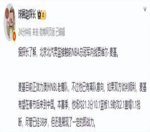 2023年被NBA裁掉之后,麦基加盟波多黎各联赛巴亚蒙流浪者,并且帮助球队夺得24-25赛季波多黎各联赛冠军。本赛季,麦基加盟澳洲NBL老鹰队,首秀便砍下32分13篮板2助攻的全面数据,20中15的进攻效率也是非常恐怖。本赛季至今,麦基场均可以贡献21.3分10.1篮板1.9助攻2.1盖帽1.1抢断,但是,麦基已经有了离队的意向,如果北京首钢与麦基谈判顺利,麦基有望在春节后来到中国。
